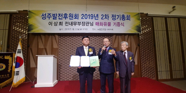 【경상포커스=전상철기자】성주군에 따라면 지역 출향인사로 구성된 성주발전 후원회(회장 이심)는 지난 22일, 서울 뉴힐탑호텔에서 제2차 정기총회를 열고 남부내륙철도 성주역 유치를 위한 결의를 다지고 이상희 前 내무부 장관의 매화유물 기증식 등을 가졌다.