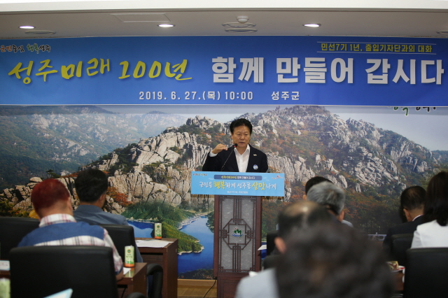 이병환 성주군수, 민선7기 1년, 출입기자단 초청 주요 성과와 군민행복 100대 과제 밝혀【경상포커스=전상철기자】이병환 성주군수는 27일 언론인 40여명을 초청해 취임 1주년 기자간담회를 열고 지난 1년의 6대 분야 주요 성과와 향후 추진방향, 군민행복 100대 과제를 밝혔다.