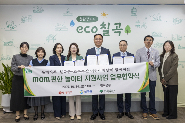 경상포커스=김경희기자지난 24, 칠곡군은 롯데그룹과 초록우산 어린이재단이 함께하는 ‘mom 편한 놀이터 조성을 위한 업무협약을 체결했다.